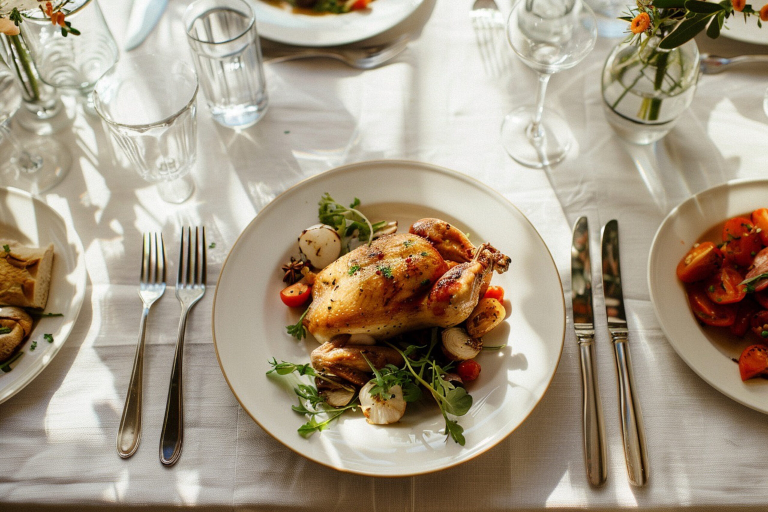 Roast Chicken with Sage and Apple Stuffing offers comfort food elevated for wedding dining, perfect for guests seeking familiar yet refined flavors. *Can also be elevated further with Cornish Hens and other game.