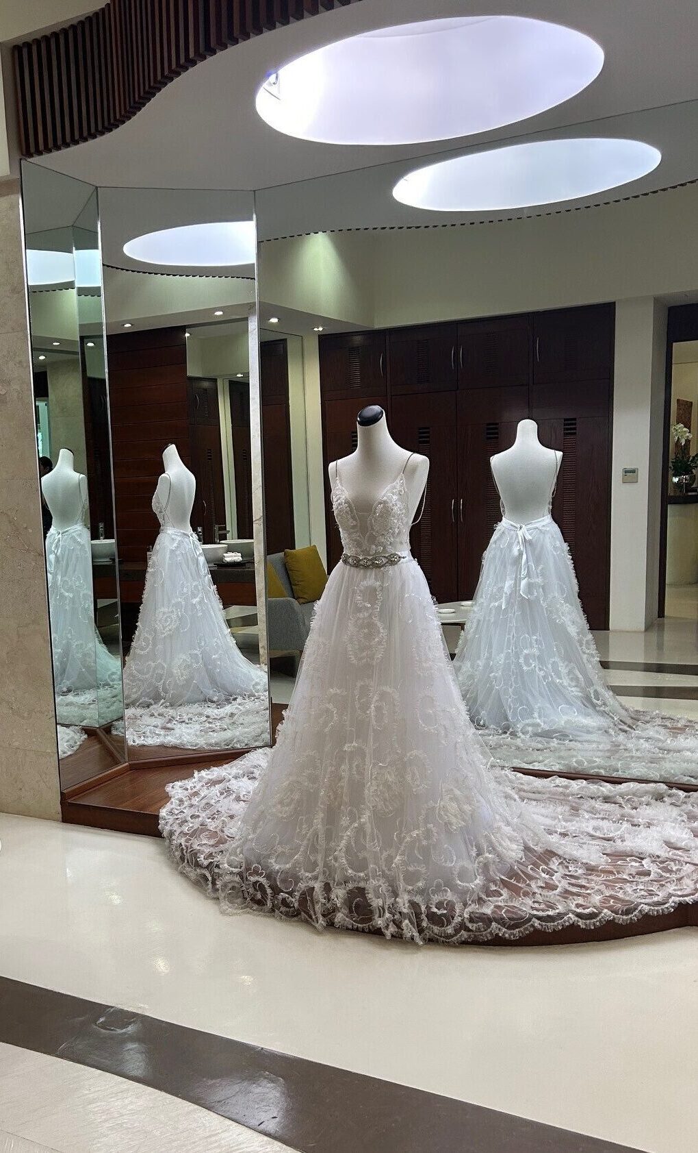 A bridal room has floor-to-ceiling mirrors.