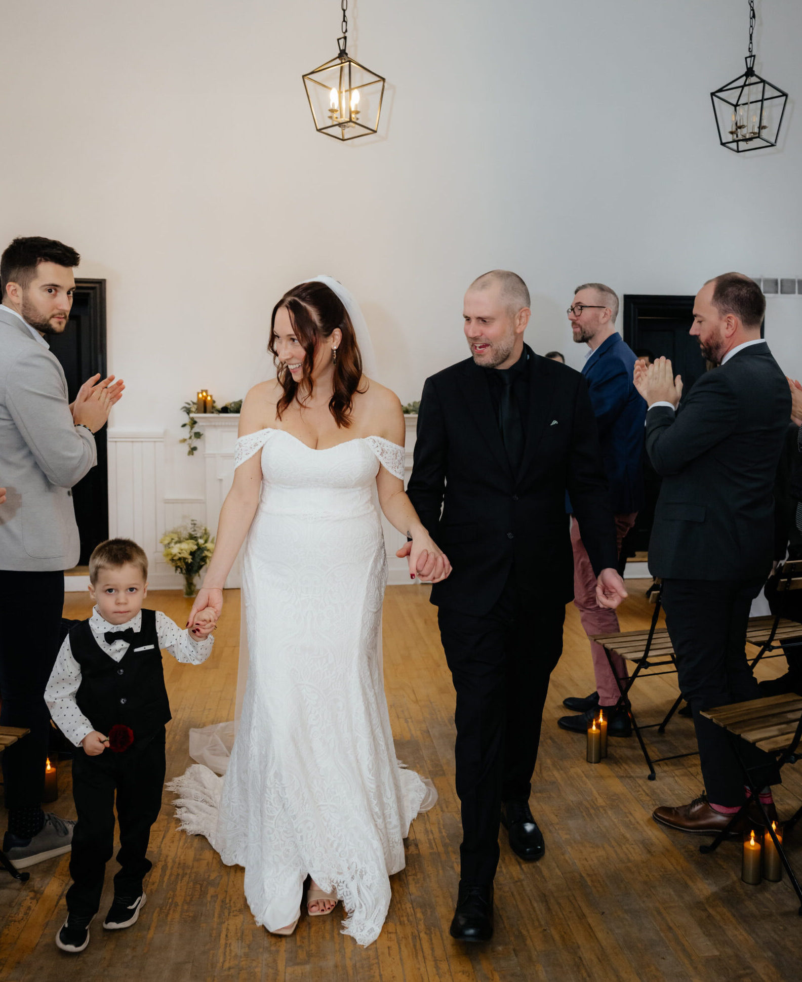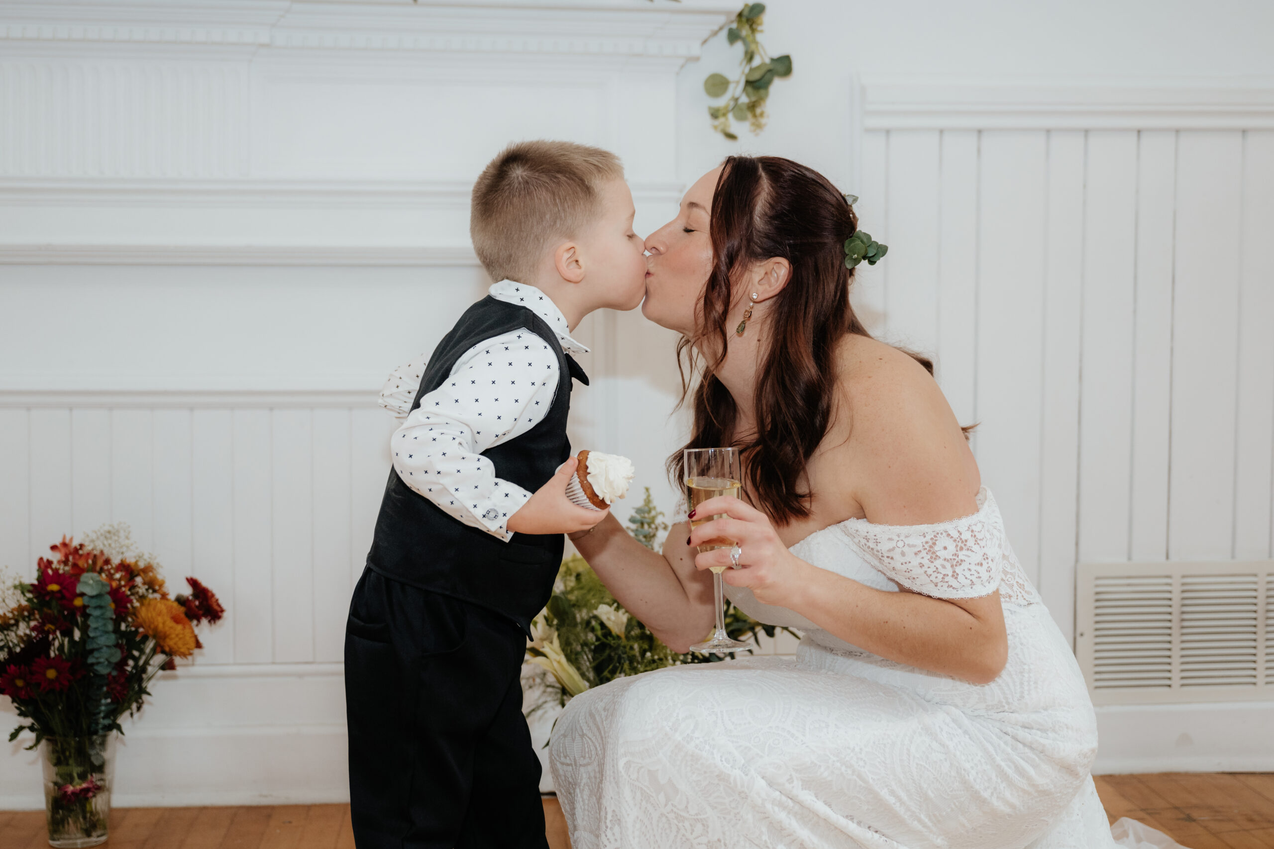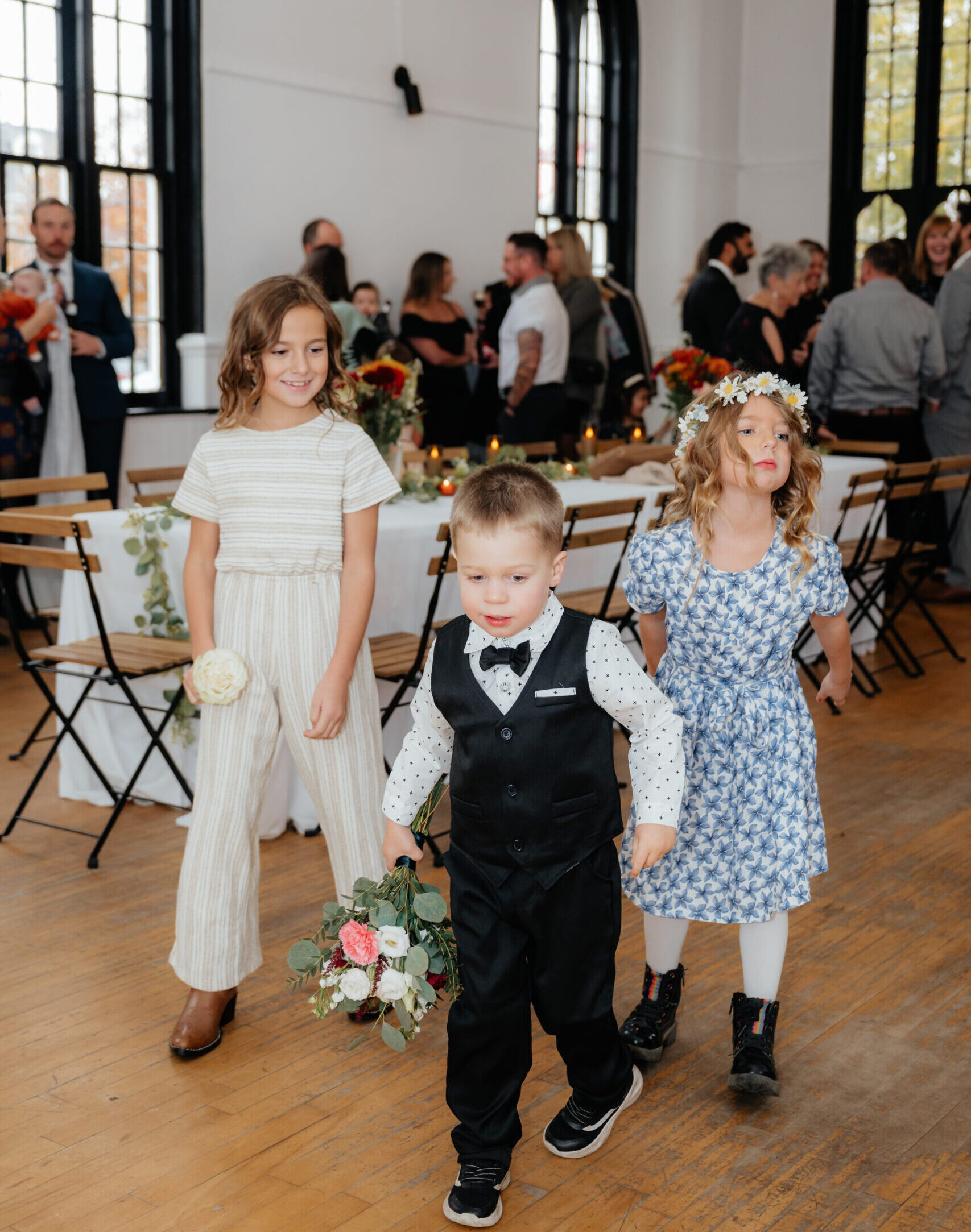 Cal was another star of the day. His mom reports he was “super shy at first—and then he stole my bouquet. The cutest moment,” she adds, “was him taking flowers out of the bouquet during the signing and running to Sam’s daughters and giving them each a flower. We call them his cousins and he loves them like family. Post-ceremony, he had a blast dancing and running around with his friends, keeping everyone giggling.”