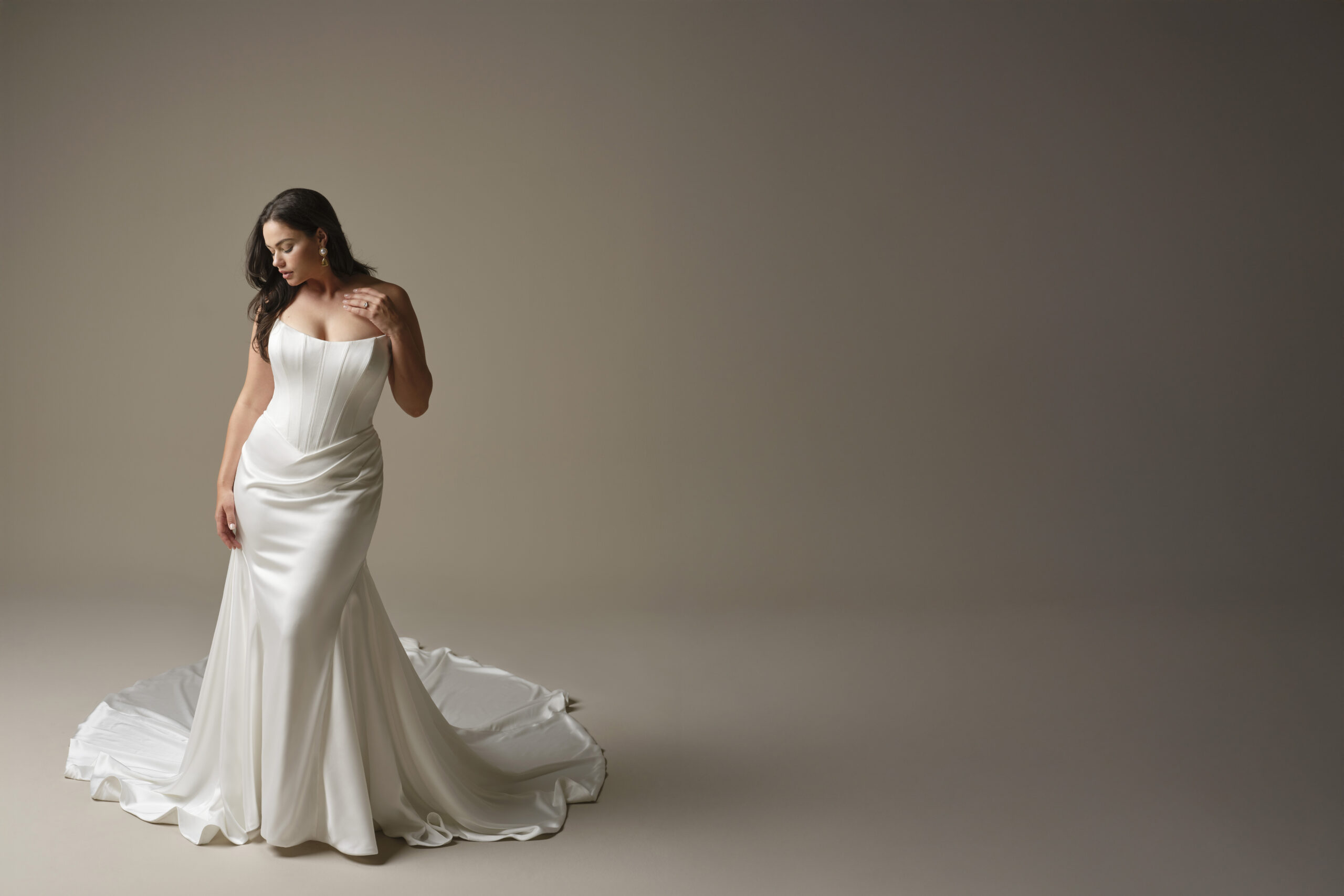 Front or back (or front and back!), the deep, sculptural V makes a bold bridal fashion statement. Modern and elegant, the look will elongate your torso and highlight your waist.